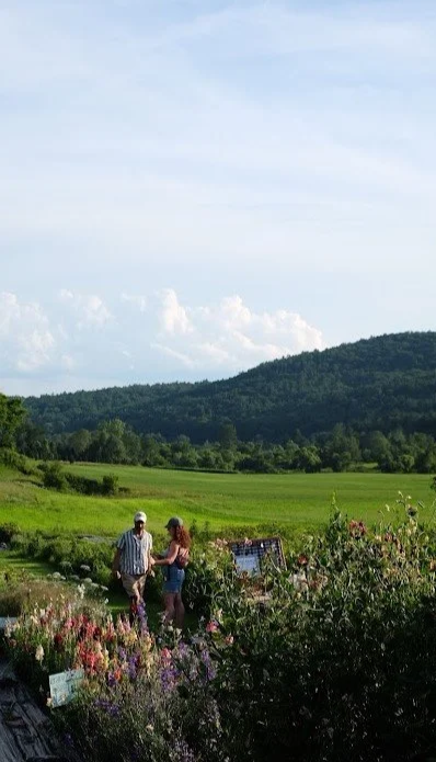 Come early or stay late. Beginning in July wander the fields and Pick Your Own Healthcare — vegetables, cut flowers, tea and berries galore. Blueberries in July, raspberry rows in August, and the crown jewel of autumn — dahlias in September and October, hundreds of them, in bloom, with the Black Creek Valley as a gorgeous background. In the fall you'll also find specialty pumpkins and mums brough in from a local farm — the kind of autumn abundance that makes you want to fill your car and head home happy. The farm stand is self-serve. The fields are unhurried. There's no rush here.