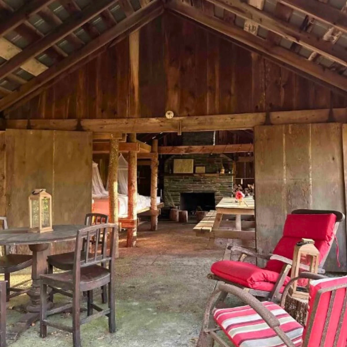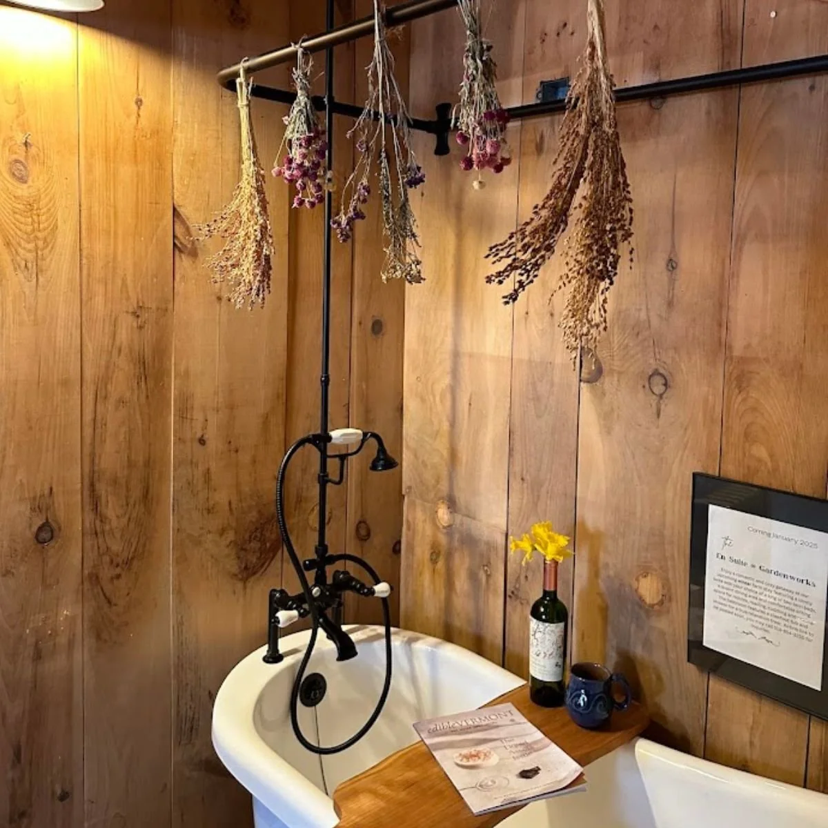 Nestled in our stunning post and beam addition to the historic red barn — once a gathering space and café entrance, now transformed into a warm, unhurried sanctuary — available year-round for those who need a little more than a night away. A king bed, a light-filled dining area, a comfortable sitting space for movies, reading, and long conversations. Your own patio with a screen door. And a bathroom that will make you never want to leave — warm wooden walls, dried farm flowers hanging overhead, and a gorgeous clawfoot tub waiting for you.